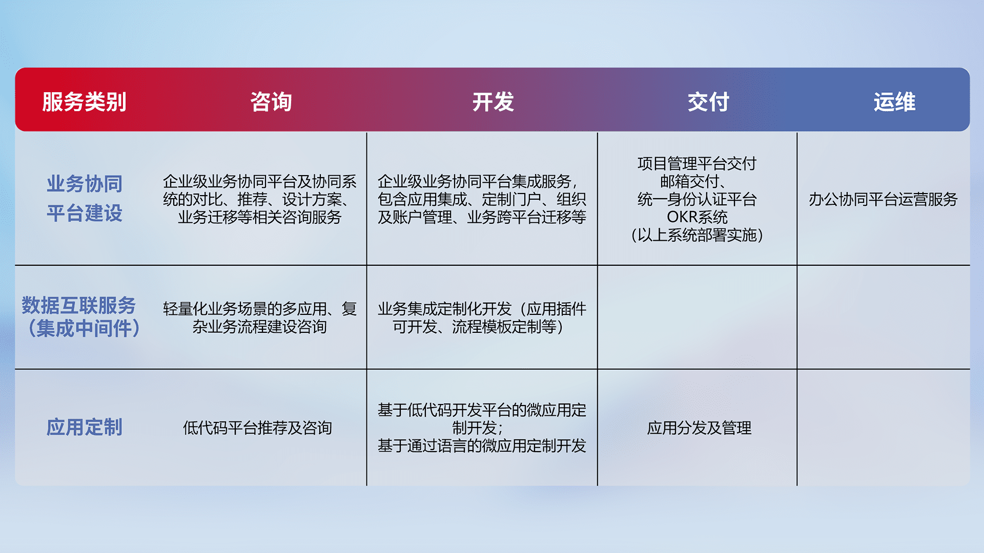 针对钉钉、、、、企微、、IDaas等平台级产品提供产品的规划、、方案、、交付、、、、定制化开发等服务,,,,实现如统一协同办公、、、智能客户服务、、、、混合会议管理、、智能数据查询、、、等业务场景,,,实现数字化转型。。