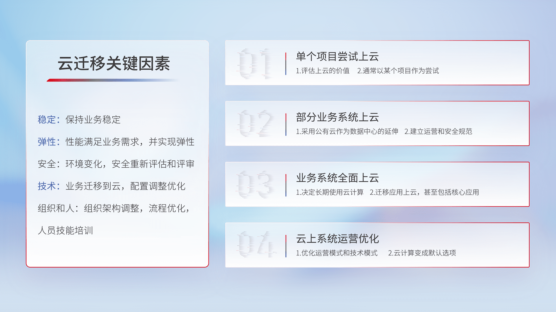 结合实际业务,,,从规划设计、、、云平台选型、、、、云原生改造、、、数据迁移、、、、集成交付,,,迁移全过程为客户识别最佳上云路径,,,,做好风险识别管理,,设计网络架构、、、身份权限、、安全审计合规、、、操作审计、、、日志审计、、监控告警策略、、多站点容灾设计等,,对云上基础设施进行整体规划,,提升IT治理水平,,,,以满足弹性、、高可用、、、高性能的需求。。。