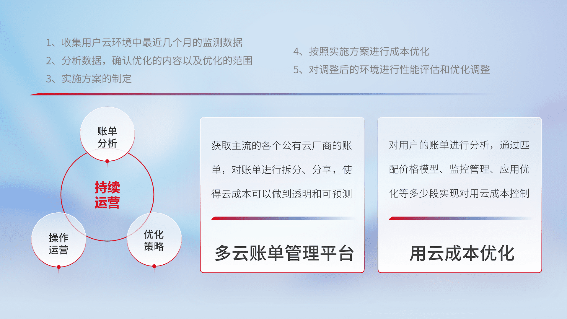 通过多云纳管,,,,以统一的资源数据模型把客户的云资源进行抽象和封装,,,进而实现对多云资源的统一操作,,,保障云资源管理的可靠性、、、稳定性与可用性。。量身定制化运维内容,,配置、、、、开发运维、、补丁管理、、备份、、、、监控、、、、认证和访问管理、、审计和日常巡检等,,保障在用云过程中的可靠度,,稳定度以及高可用率。。。