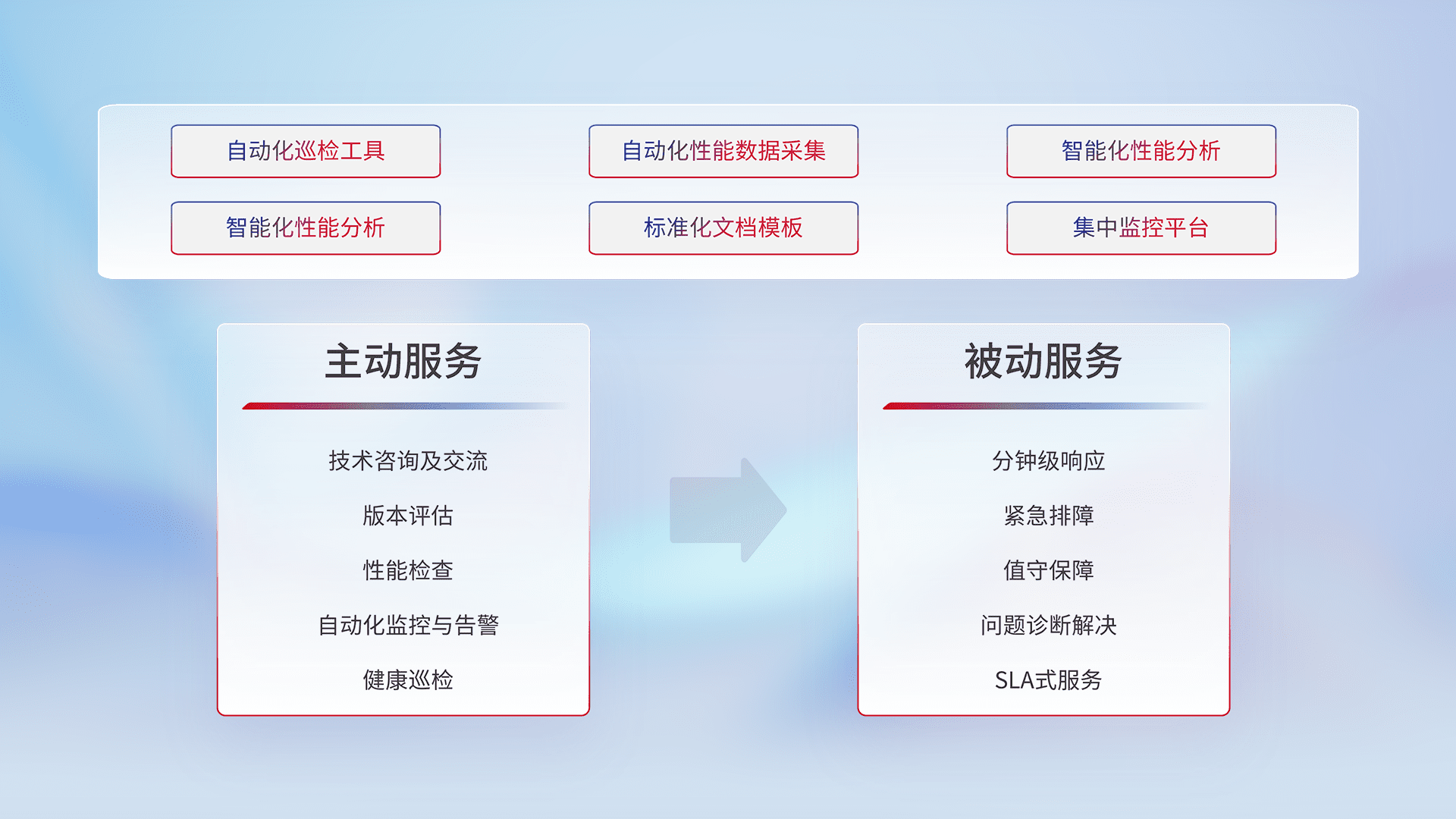 智能化工具和标准化文档,,,保障服务质量,,,提供主动服务(包含技术咨询、、版本评估、、、、性能检查、、、、自动化监控与告警、、健康巡检)和被动服务包含(分钟级响应、、、、紧急排障、、、值守保障、、问题诊断解决、、、SLA服务)。。